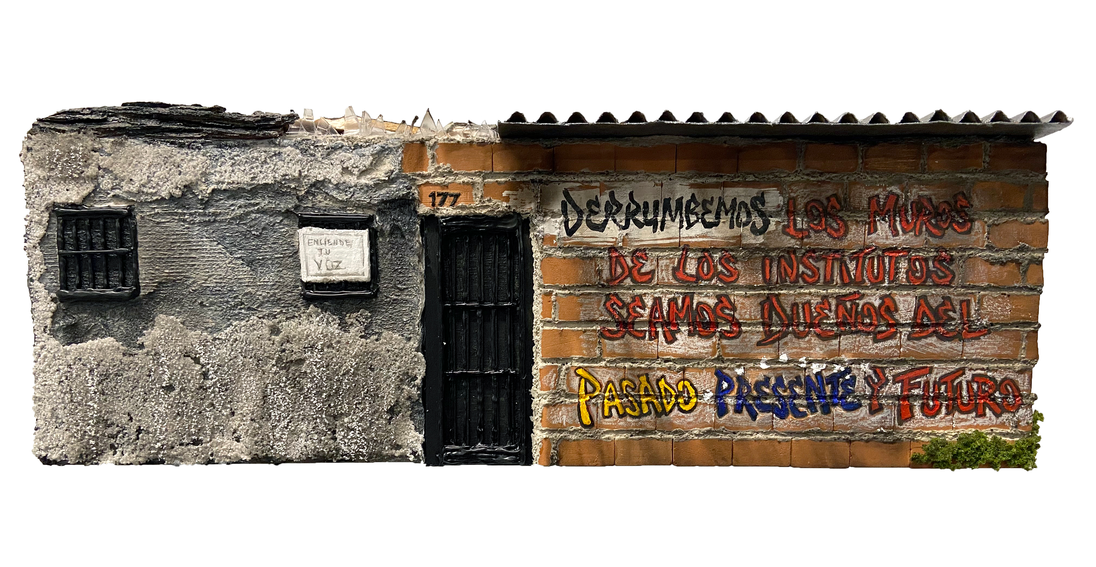 This sculpture was inspired by a house façade located in Valencia, Carabobo, Venezuela at Los Jabillos Street, #177. The text featured in this piece comes from an excerpt of a poem I wrote that translates to: